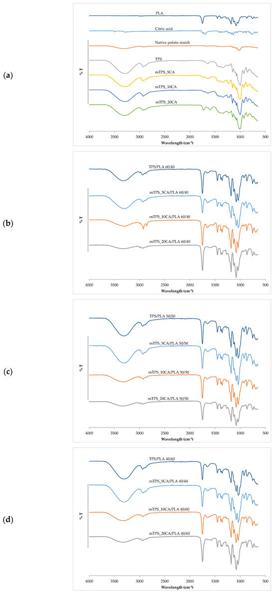 FTIR spectra of (a) PLA, citric acid, native potato starch, TPS, and mTPS; (b) TPS/PLA and mTPS/PLA 60/40; (c) TPS/PLA and mTPS/PLA 50/50; and (d) TPS/PLA and mTPS/PLA 40/60 biopolymeric blends.