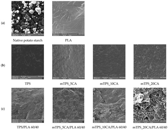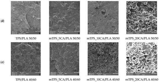SEM micrographs of (a) native potato starch and PLA; (b) TPS and mTPS; (c) TPS/PLA and mTPS/PLA 60/40; (d) TPS/PLA and mTPS/PLA 50/50; and (e) TPS/PLA and mTPS/PLA 40/60 biopolymeric blends.