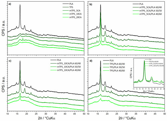 XRD diffraction of all constituents and biopolymeric blends: (a) PLA, TPS and differently esterified TPS; (b) PLA and different blends of 5%-esterified-TPS/PLA; (c) PLA and different blends of 10%-esterified-TPS/PLA; (d) PLA and different blends of unesterified-TPS/PLA; Inset: Comparison of PLA and TPS/PLA = 60/40 blends.