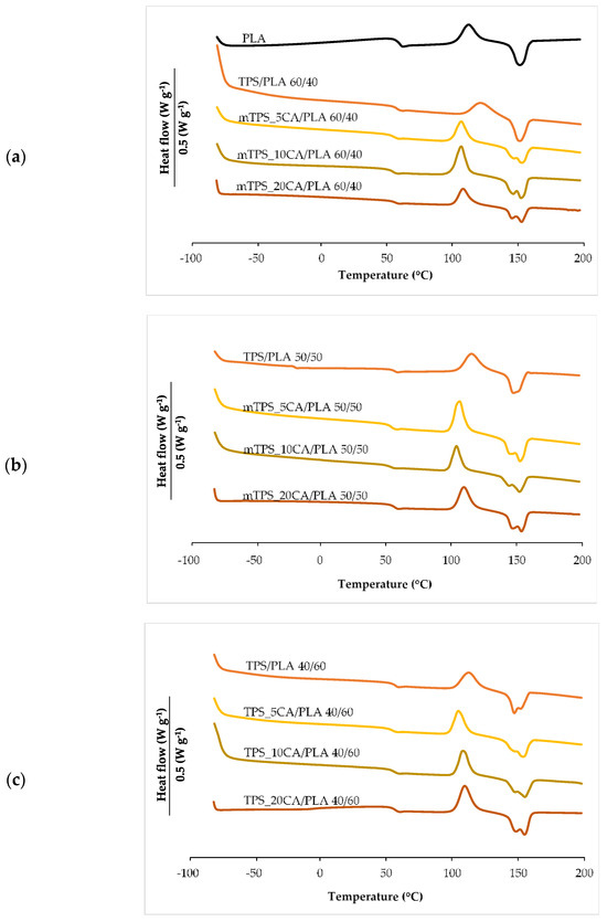 DSC thermograms of (a) PLA, TPS/PLA, and mTPS/PLA 60/40; (b) TPS/PLA and mTPS/PLA 50/50; and (c) TPS/PLA and mTPS/PLA 40/60 biopolymeric blends.