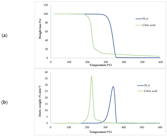(a) TG; (b) DTG curves of PLA and citric acid.