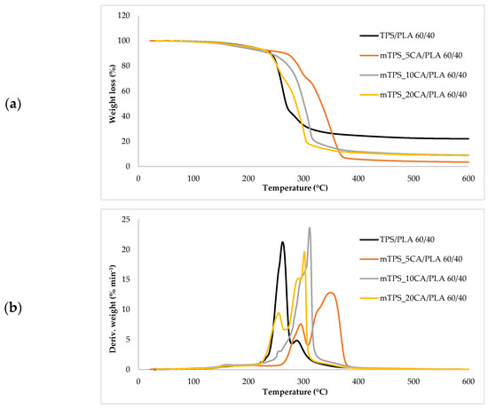 (a) TG; (b) DTG curves TPS/PLA and mTPS/PLA 60/40 biopolymeric blends.