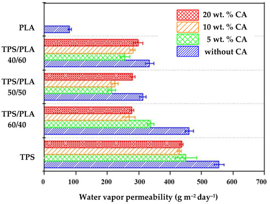 Figure 10 shows the WVP results for biodegradable polymer blends based on TPS and PLA, with and without citric acid modification. Due to its hydrophobic nature, pure PLA has a low WVP of 80.435 g m−2day−1. In contrast, unmodified TPS has a significantly higher permeability of 554.545 g m−2day−1, which is consistent with the hydrophilic nature of the starch. The WVP values of all TPS/PLA blends lie between the two extreme values of the pure components. The lowest permeability is observed for the mTPS_5CA/PLA 50/50 blend, which is probably due to the optimal balance between the hydrophobic PLA and modified TPS phases. On the other hand, the highest permeability is observed with mTPS_5CA/PLA 60/40, which is due to a higher proportion of hydrophilic TPS. Interestingly, in contrast to the results for other starch sources, Scala-based blends do not show a consistent downward trend in WVP with increasing CA content. The addition of 5 wt.% CA decreases permeability, which is due to partial esterification between the hydroxyl groups of the starch and the carboxyl groups of the citric acid. This crosslinking reduces the chain mobility and the free volume, which improves the barrier properties [9,10,36,42]. However, further increasing the citric acid content (10 and 20 wt.%) leads to higher WVP values. This is probably due to the following: excess unreacted citric acid acts as a plasticizer and increases the flexibility and permeability of the matrix and possibly acid-catalyzed hydrolysis of glycosidic bonds, resulting in reduced molecular weight and increased porosity [19,31,32,42]. These results suggest an optimal CA content of ~5 wt.% to improve WVP performance in TPS/PLA blends.
