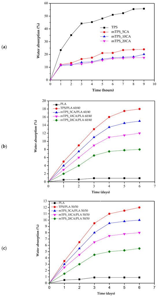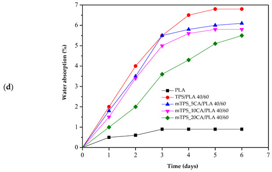 Water absorption of (a) TPS and mTPS; (b) PLA, TPS/PLA, and mTPS/PLA 60/40; (c) PLA, TPS/PLA, and mTPS/PLA 50/50; and (d) PLA, TPS/PLA, and mTPS/PLA 40/60 biopolymeric blends.