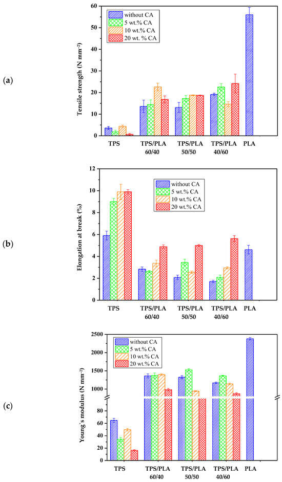 Mechanical properties of biopolymeric blends: (a) tensile strength; (b) elongation at break; (c) Young’s modulus.