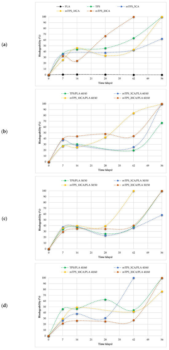 Biodegradability of (a) PLA, TPS, and mTPS; (b) TPS/PLA and mTPS/PLA 60/40; (c) TPS/PLA and mTPS/PLA 50/50; and (d) TPS/PLA and mTPS/PLA 40/60 biopolymeric blends.