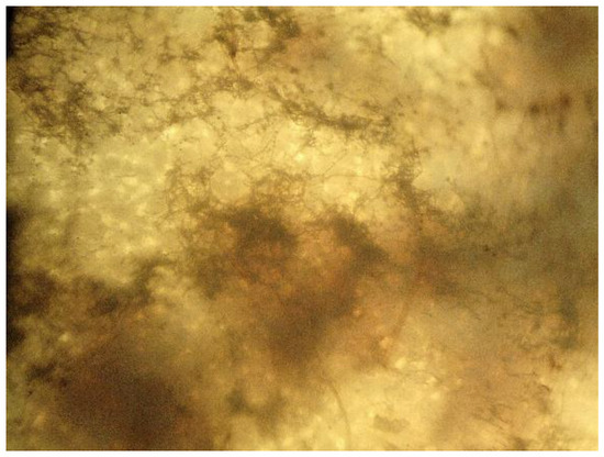 Microphotograph of mold on the sample mTPS_20CA/PLA 50/50, taken on the 28th day of biodegradation with a light microscope (400×).