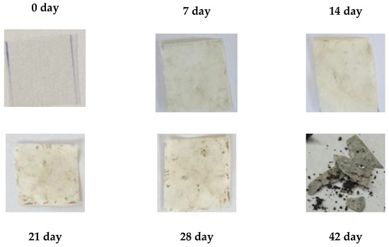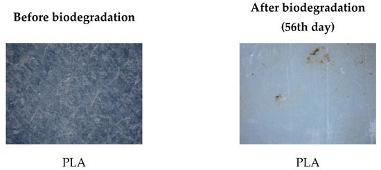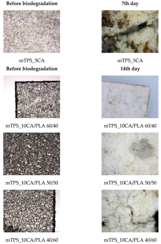 However, excessive crosslinking or reduced swelling capacity, especially at lower citric acid concentrations, may limit microbial access, which explains the slower degradation in the 5 wt.% samples. The microscopic analysis (Figure 16 and Figure 17) confirms the progressive structural degradation of the TPS/PLA blends. In the early stages (day 7), signs of surface erosion and microbial colonization can be seen. On day 14, the blends, especially those with 10 wt.% CA, show increasing fragmentation and roughened surfaces, indicating advanced biodegradation. By day 28, the samples show extensive degradation, and by day 42, the surfaces are highly porous and fractured, indicating a breakdown in the integrity of the material. These microscopic images confirm the hypothesis that citric acid modification accelerates degradation, especially in well-dispersed, amorphous TPS domains. In contrast, pure PLA remained structurally intact throughout the 56-day period (Figure 18 and Figure 19) and showed no signs of degradation or microbial colonization, which is consistent with previous studies [57]. SEM micrographs (Figure 2) confirm the smooth, unaltered surface of PLA and emphasize the need for blending with biodegradable fillers such as TPS to improve environmental compatibility. The biodegradability of TPS and TPS/PLA blends is strongly influenced by the composition and the citric acid content. While pure TPS degrades quickly, the degradation rate is reduced by the blend with PLA, depending on the blend ratio and degree of modification. CA generally promotes biodegradation in mTPS_XCA-based blends, especially at 10 and 20 wt.%, although the effect may vary due to complex interactions between material structure, hydrophilicity, and microbial accessibility. These results highlight the potential of TPS/PLA blends as biodegradable alternatives in packaging, where the rate of degradation is adjustable depending on the formulation and modification strategy.