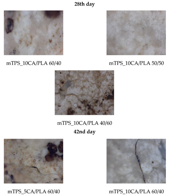 Surface microstructure of mTPS/PLA biopolymeric blends after 28th and 42nd day of biodegradation obtained with polarizing optical microscope (100×).