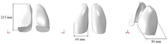 The respiratory system was selected as a case study due to its complexity in terms of density and elasticity mimicking. Specifically, a solid CAD model of the lungs, without any internal alveolar structure, based on the size of the lungs of an adult male, was created and used for numerical simulations. The model was imported in the finite element software ABAQUS CAE, as shown in Figure 1, where the geometric dimensions are also reported. The CAE model consisted of both lungs represented as a single, solid, and internally filled part. It was prepared for discretization by making the required cuts to accommodate the mesh.