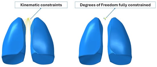 Because the numerical model did not include the trachea and bronchi, kinematic constraints were implemented that connected the inner lateral surfaces of the lungs to a control point, which represented the larynx. Moreover, the degree of freedom of the reference points were fully constrained. Boundary conditions are shown in Figure 3.
