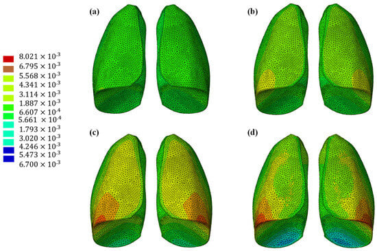 Out-of-plane displacement of the lung at different time instants: (a) 0.325 s, (b) 0.65 s, (c) 0.975, and (d) 1.3 s.