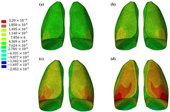 Out-of-plane displacement of the lung (Flexible 80A resin) at different time instants: (a) 0.325 s, (b) 0.65 s, (c) 0.975, and (d) 1.3 s.