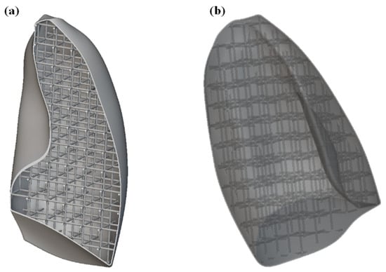 The first step was to import the CAD model of the lungs within the nTOP software. For simplicity and to reduce the computational cost, only one of the lungs was considered. Subsequently, the solid lung model was voided by generating a 1 mm thick shell, compatibly with 3D printing capabilities. The interior of the lung was then filled with SC cells of size 20 × 20 × 20 mm, with a thickness of 2 mm. The image of the internal part of the lung is shown in Figure 9a, while the entire lung, including shell and lattice infill, is shown in Figure 9b.