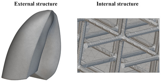 The new lung model was meshed using tetrahedral elements. An edge length of 2 mm was considered. A very fine mesh was needed to properly discretize the internal lattice structure, as shown in Figure 10. This level of detail was essential to correctly capture the mechanical response of the lattice during the simulation. The increased mesh density, while computationally demanding, allowed for a more realistic approximation of the deformation behavior of the infilled lung model. Finally, the mesh model was exported in compatible format and imported into Abaqus CAE software for finite element analysis, preserving the integrity of both the outer shell and internal lattice geometry throughout the simulation workflow.