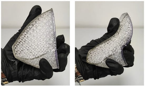 The lung lobe model was transferred to Form 3BL software for printing, named PreForm, to choose the model orientation, define the supporting structures, and perform the slicing. Flexible80A resin was used for the printing, which was characterized by a hardness Shore value of 80 and supported a layer thickness of 0.1 mm. The image of the printed part, highlighting its flexibility, is shown in Figure 13.