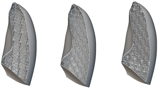 All the considered unit cells are shown in Figure 17. In all cases, the skin thickness was 1 mm. The unit cell dimensions were 30 × 30 × 30 mm, with a consistent wall thickness of 2 mm.
