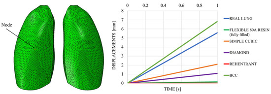 Figure 18 shows the out-of-plane displacement trend comparison measured at a representative node positioned at the center of the lung model (red dot in Figure 19), reported as a function of the typical respiratory time. The results in Figure 19 highlight notable differences in the deformation trends associated with the three cell types, offering useful insight for the selection of the most appropriate lattice architecture to better approximate the elastic behavior of real lung tissue. Among the three analyzed unit cells, the BCC cell exhibited the behavior that most closely mimics that of the lung. However, it appeared to be even more elastic, suggesting that the internal infill was too sparse and should be slightly densified. Indeed, considering cell dimensions of 20 × 20 × 20 mm, with a consistent wall thickness of 2 mm and a skin of 1 mm, the results were very close to the one obtained with the lung material model, as shown in Figure 19, which shows the out-of-plane displacement trend comparison measured at a representative node positioned at the center of the lung model (red dot in Figure 19), reported as a function of typical respiratory time.