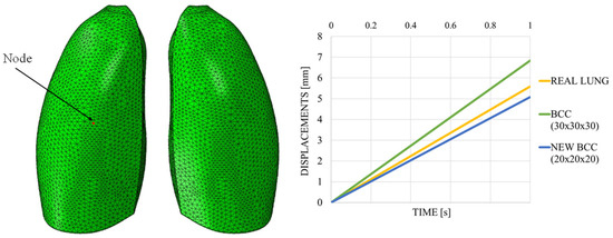 Numerical analysis was performed, considering the same boundary conditions of Figure 3, including the fixed point, representative of the larynx, and loading conditions of Figure 4, which considered a uniformly distributed surface depression, mimicking breathing. Material properties of the Flexible 80A resin, in Table 2, were considered. In contrast to previous analyses, only one lung was taken into account to reduce the computational effort due to the very fine mesh size resulting from the presence of the lattice structure.