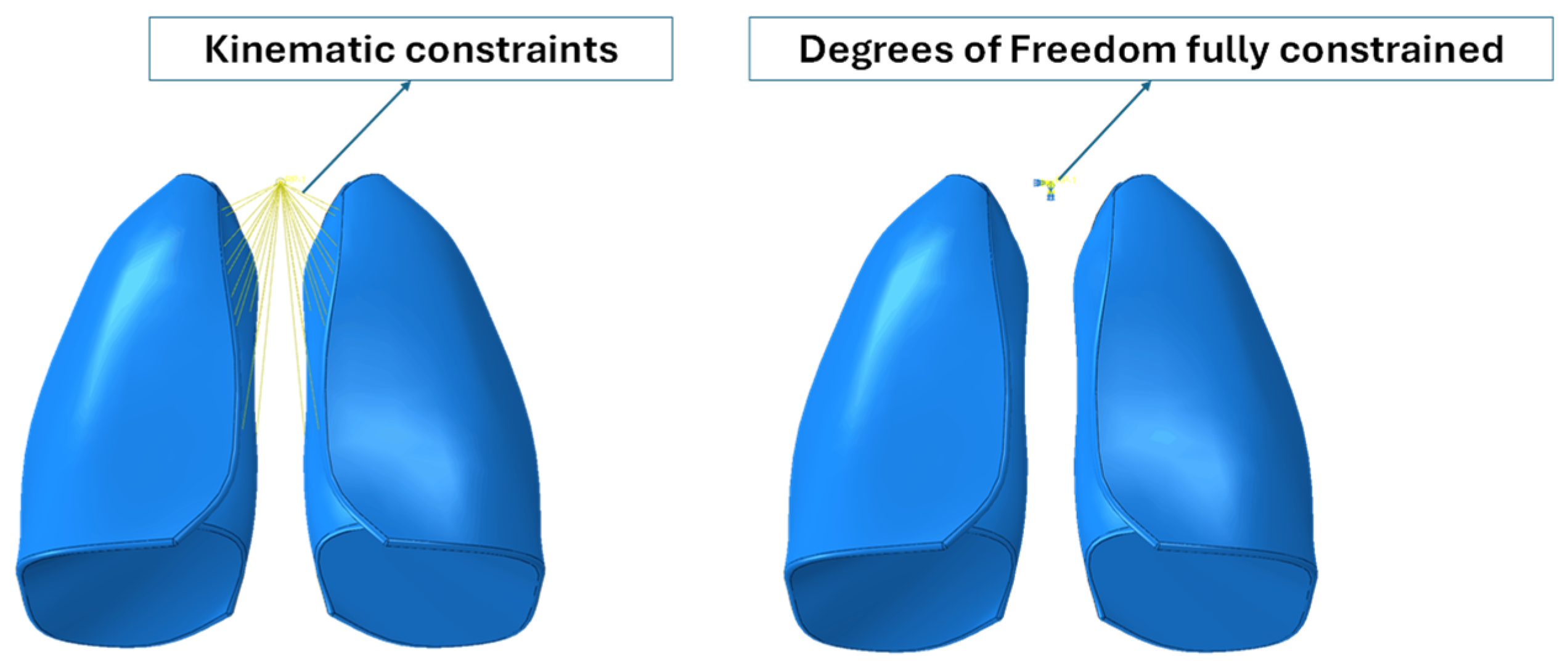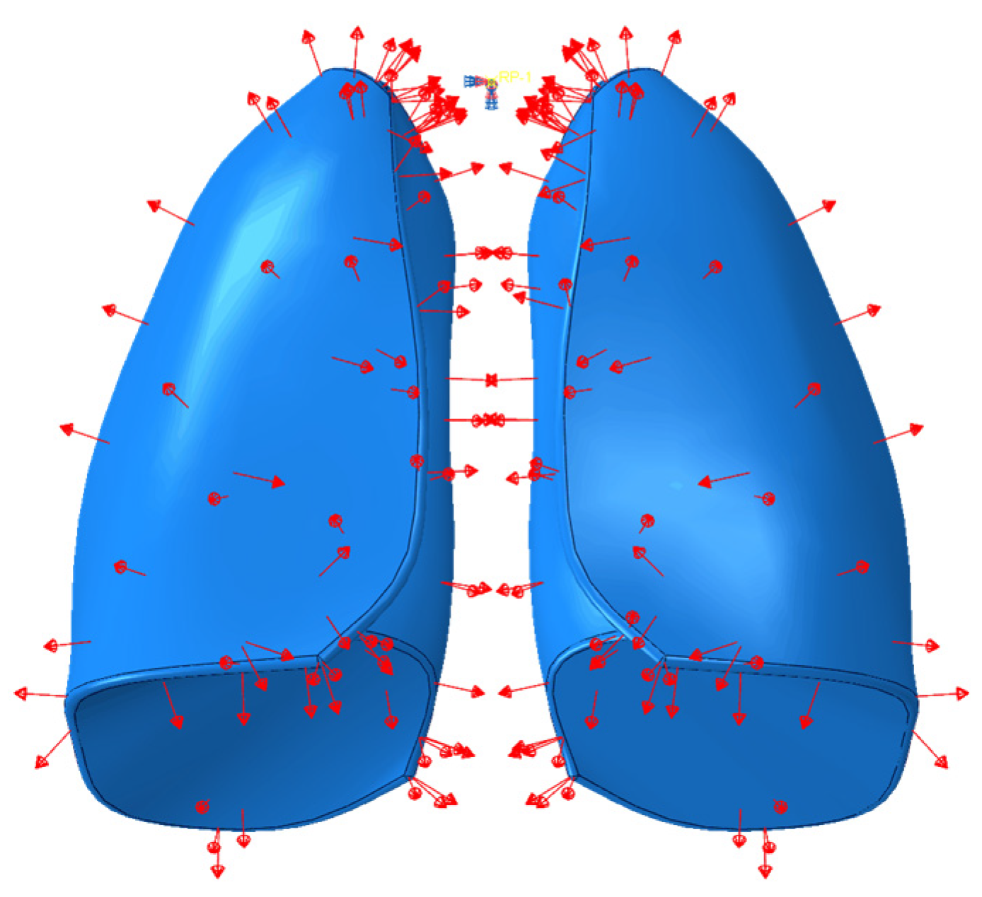 Because the numerical model did not include the trachea and bronchi, kinematic constraints were implemented that connected the inner lateral surfaces of the lungs to a control point, which represented the larynx. Moreover, the degree of freedom of the reference points were fully constrained. Boundary conditions are shown in