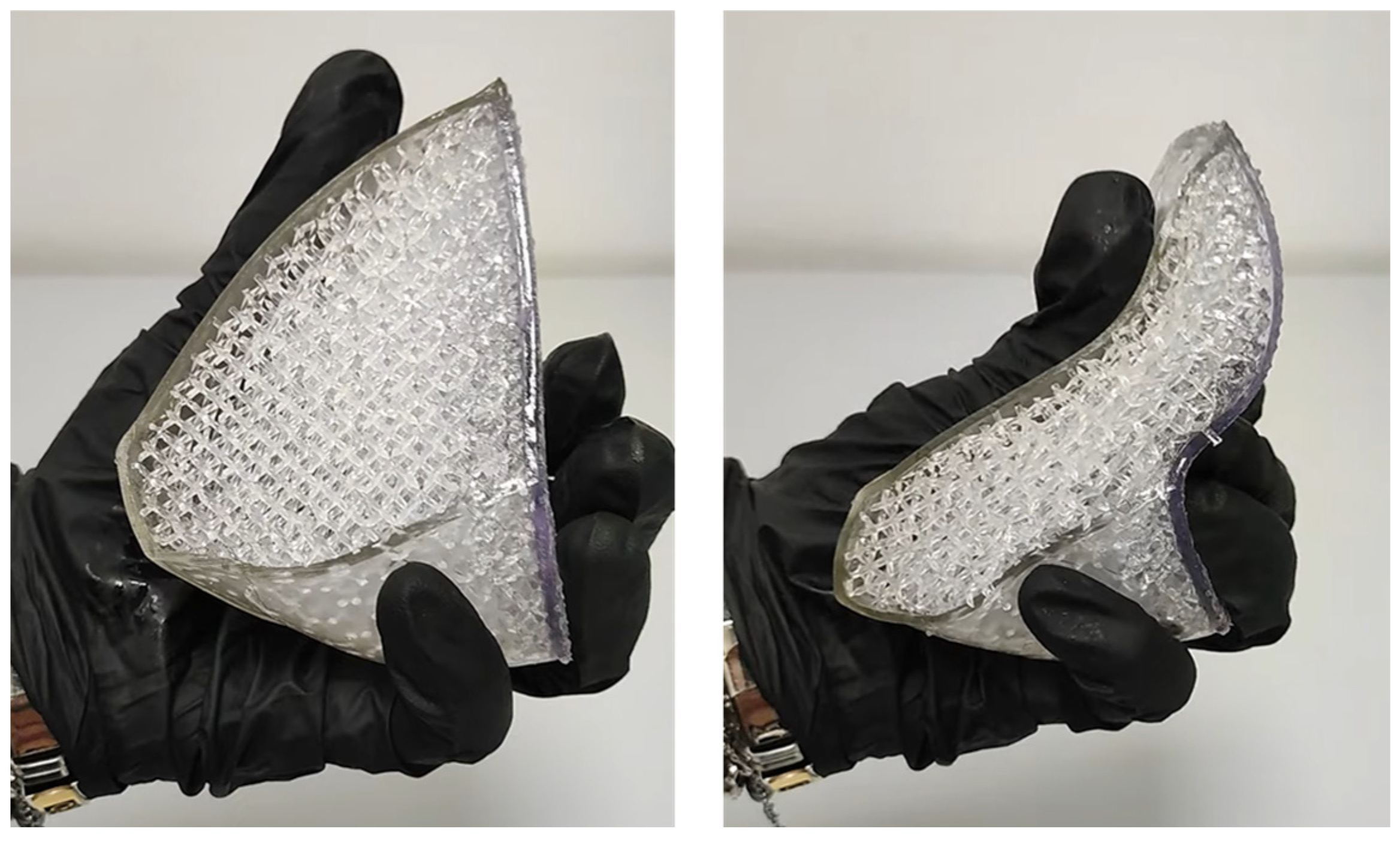 The lung lobe model was transferred to Form 3BL software for printing, named PreForm, to choose the model orientation, define the supporting structures, and perform the slicing. Flexible80A resin was used for the printing, which was characterized by a hardness Shore value of 80 and supported a layer thickness of 0.1 mm. The image of the printed part, highlighting its flexibility, is shown in