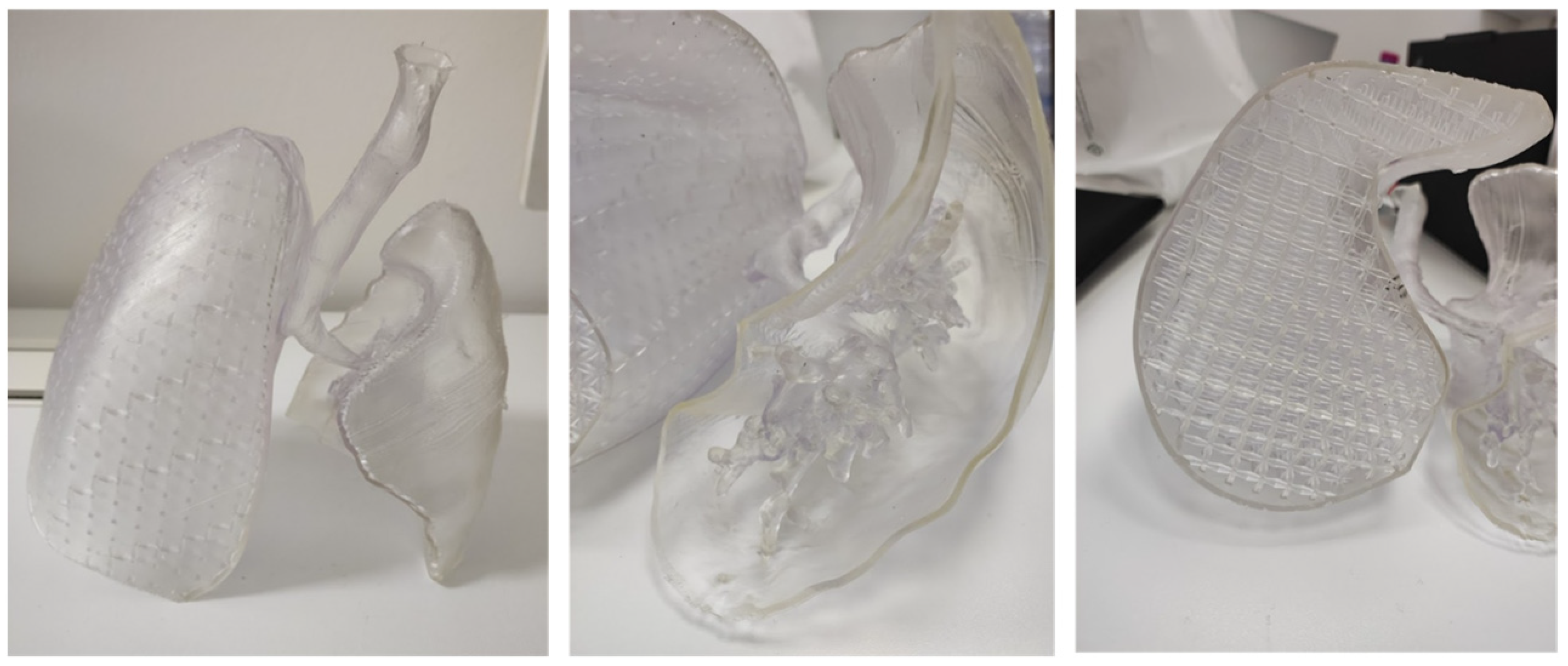 Although the combination of the selected resin and the adopted lattice infill improved the mechanical response of the model, it was still insufficient to faithfully replicate the complex behavior of real lung tissue. Both the material properties of the resin and the specific lattice configuration currently represent limiting factors. Nevertheless, the proposed approach remains promising and lays the groundwork for future developments.