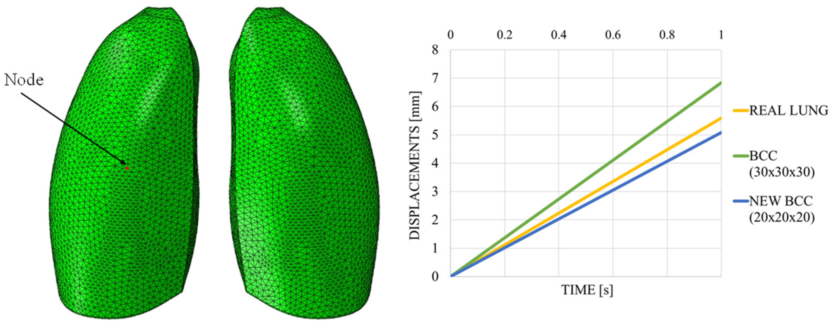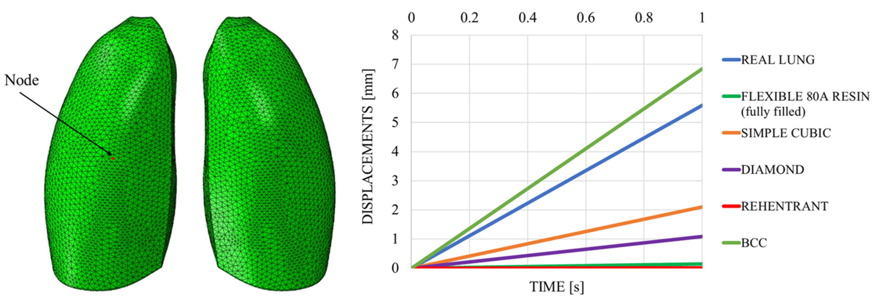 Table 2, were considered. In contrast to previous analyses, only one lung was taken into account to reduce the computational effort due to the very fine mesh size resulting from the presence of the lattice structure.