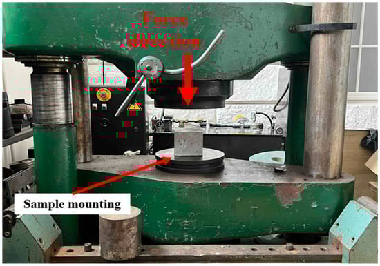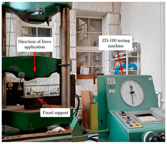 The static compression test was carried out on a ZD-100 universal testing machine (VEB Werkzeugmaschinenkombinat “Fritz Heckert”, Betrieb Rauenstein, Leipzig, Germany) (Figure 3) at a force increment rate of 0.6 MPa s−1. Specimens were loaded until failure or until the increase in load visibly ceased.