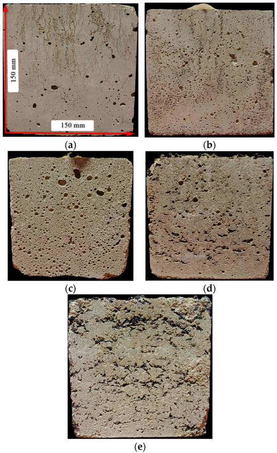 Changes in specimen morphology were observed as the sand replacement aggregate was varied. Specimens containing copper slag exhibited the closest resemblance to the control cubes, whereas the most pronounced differences occurred in mixtures incorporating glass granulate, polypropylene and SBR rubber. Cubes with glass granulate were markedly more porous, indicating water interaction behavior that differs substantially from that of conventional sand.