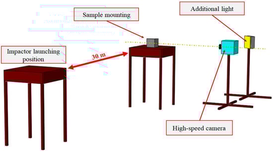 Shooting was performed from a distance of 30 m in compliance with STANAG 2280 (for 9 mm impactor size it was 5 m). The test set-up included a Phantom VEO 710L high-speed camera (Vision Research, Wayne, NJ, USA) that captured the bullet–target interaction and allowed determination of residual bullet velocities after perforation (Figure 4). The principal assessment criterion was whether the impactor penetrated the specimen. Weather conditions during testing were clear skies, no wind and an ambient temperature of 30 °C.