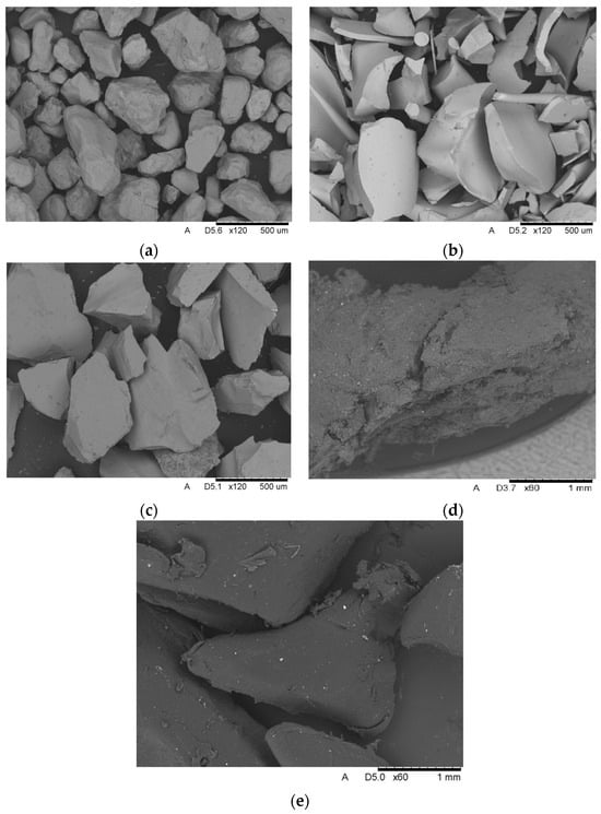 Microscopic images: (a) sand, ×120; (b) copper slag, ×120; (c) glass granulate, ×120; (d) SBR rubber, ×60, (e) polypropylene petals, ×60.