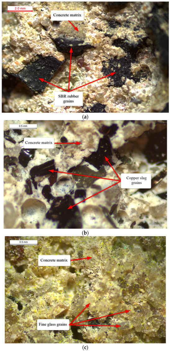 Replacing natural aggregate with waste-derived materials markedly influenced the behavior of concrete composites at both the micro- and macroscale. Each additive investigated—copper slag, glass granulate, and SBR rubber granulate—modified the cement–aggregate interfacial transition zone in a distinct manner, thereby governing crack-propagation patterns and the mode of mechanical energy storage within the material.