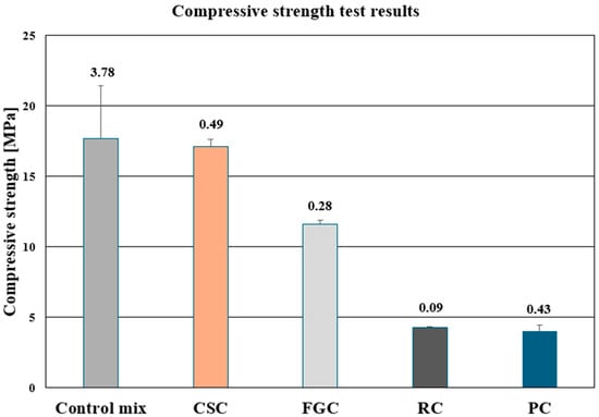 As shown in Figure 7, all mixtures display small standard deviations. The greatest variability, about 20%, appears in the RC concrete, underscoring the microstructural instability introduced by the elastic rubber aggregate. By comparison, the reference and CSC mixtures have deviations below 10%, indicating repeatable load capacity resulting from a uniform interfacial transition zone between cement paste and aggregate.