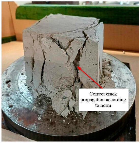 The mixtures were evaluated for compressive strength, considered the primary parameter characterizing the composite. Testing followed PN-EN 12390-3:2011/AC:2012, “Testing hardened concrete, Part 3: Compressive strength of test specimens” []. The specimens subjected to static compression were cubes measuring 10 × 10 × 10 cm (Figure 1 and Figure 2).