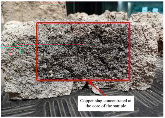 Energy dissipation analysis was not feasible because the recording speed, 9000 frames per second, was insufficient relative to the impactor velocity. It was therefore assumed that the velocity remained nearly unchanged and that the energy loss was negligible, which in turn indicates poor dynamic performance of the copper slag specimens. In all three samples the slag formed a core concentrated in the interior of the material. This behavior may result from processing deficiencies, such as inadequate vibration or an improperly selected mix design (Figure 11).