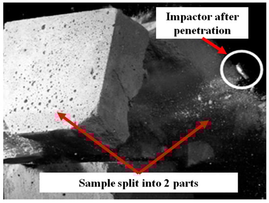 After the optimal type had been established, additional tests were carried out on specimens in which sand was replaced with copper slag or glass granulate. The copper-slag specimen, when struck by a 7.62 × 39 mm FMJ PS impactor, was fully perforated and then fractured into four main pieces, producing a characteristic cross-shaped crack pattern (Figure 10).