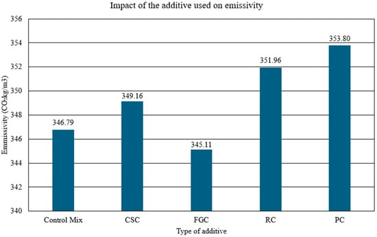 A preliminary comparative assessment was carried out to quantify the CO2 emissions associated with producing three modified concretes—containing copper slag (CSC), glass granulate (FGC) and SBR rubber granulate (RC)—and to benchmark these mixes against a reference concrete prepared exclusively with natural aggregate. The evaluation followed a simplified life cycle assessment (LCA) procedure in accordance with the guidelines in refs. [,]. For each mix, the total CO2 emission per cubic metre (kg m−3) was estimated using specific emission factors for the principal constituents: cement, 900 kg CO2 t−1; natural aggregate, 15 kg CO2 t−1; mixing water, 0.2 kg CO2 t−1; copper slag, 50 kg CO2 t−1; glass granulate, 30 kg CO2 t−1; recycled rubber, 60 kg CO2 t−1; polypropylene, 100 kg CO2 t−1. A constant cement content of 350 kg m−3 was assumed, and 10% of the natural aggregate volume was replaced by the respective waste material. All calculations followed the mass-balance equation that expresses CO2 emission per cubic metre of concrete (1) in refs. [,,,,]. Figure 14 compares the estimated emission values for the four mixtures.
