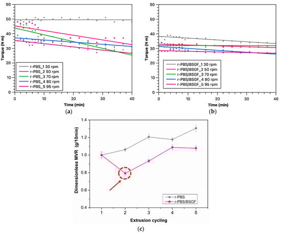 Torque trends of (a) r-PBS and (b) r-PBS/BSGF as a function of extrusion time and (c) dimensionless MFI of r-PBS and r-PBS/BSGF vs. extrusion cycling.