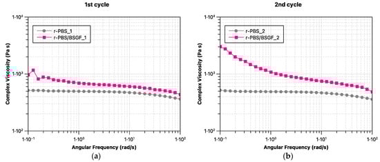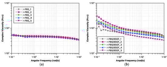 Complex viscosity of (a) r-PBS and (b) r-PBS/BSGF as a function of frequency.