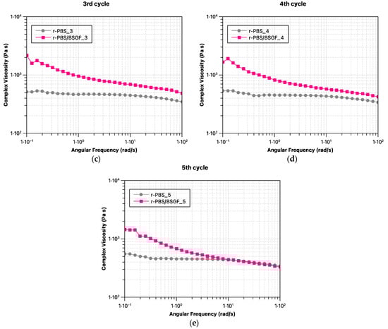 Comparison of viscosity trends of r-PBS and r-PBS/BSGF at different extrusion cycles: (a) first cycle, (b) second cycle, (c) third cycle, (d) fourth cycle, and (e) fifth cycle.