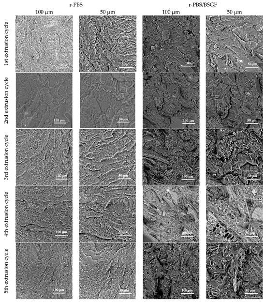 Interestingly, according to the rheological analysis, the morphologies of r-PBS/BSGF change as the extrusion cycling increases. In particular, both the appearance of the PBS host matrix and the dispersion of BSGF in the matrix change with extrusion cycling. It appears that the decoupling between PBS and BSGF and the uneven BSGF orientations become more visible with increasing processing steps. Furthermore, the morphologies of r-PBS/BSGF_4 and r-PBS/BSGF_5 show the presence of small voids, probably due to the occurrence of thermal degradation phenomena of cellulose–lignin structures. It should be noted that the r-PBS/BSGF_2 seems to have a better morphology in terms of less matrix degradation and better BSGF dispersion. The latter confirms the rheological trends and could be understood considering that only one reprocessing step is not sufficient to obtain a good BSGF dispersion in the PBS polar matrix. Therefore, at least two extrusion cycles are required to achieve a favourable balance between BSGF dispersion and matrix thermo-mechanical degradation.
