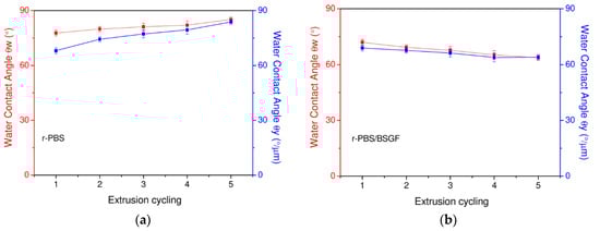 Water contact angle (WCA) values (a) θw and (b) θy for r-PBS (left) and r-PBS/BSGF (right) vs. extrusion cycling.