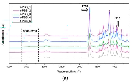 PBS is a condensation-type biopolymer characterized by hydroxyl- and carboxyl-terminated chains, with the concentration of these end groups ([OH], [COOH]) depending on the polymerisation conditions. As reported in studies on the thermal and thermo-oxidative degradation of PBS [5,15,26], the degradation mechanism mainly involves chain scission, accompanied by the formation of carboxylic acid end groups and vinyl groups. According to the literature, the formation of additional carboxylic groups reflects the increase in overall carbonyl accumulation in the 1800–1600 cm−1 range. Specifically for PBS, the formation of additional vinyl groups gives rise to peaks at 952 and 914 cm−1, which occur simultaneously with the formation of carboxylic groups, giving rise to the peak at 917 cm−1 attributed to the –C–OH bending in the carboxylic acid groups. The spectra of both r-PBS and r-PBS/GSGF in Figure 6a,b show a single peak at 916 cm−1, attributed to the bending of the intrinsic carboxylic groups that overlaps the formation of vinyl groups. It seems that the peak at 916 cm−1 slightly increases for both r-PBS and r-PBS/GSGF as the extrusion cycles increase.