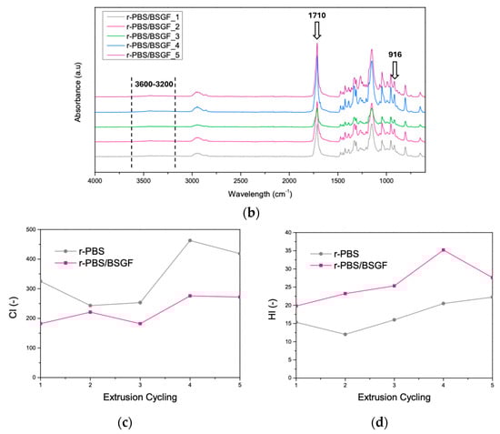 The ATR-FTIR spectra of r-PBS and r-PBS/BSGF as a function of the extrusion cycling are shown in Figure 6a,b. In addition to the spectra, the Carbonyl Index and Hydroxyl Index were calculated and are presented in Figure 6c,d. Table 1 lists the assignment of the ATR-FTIR peaks of Figure 6.