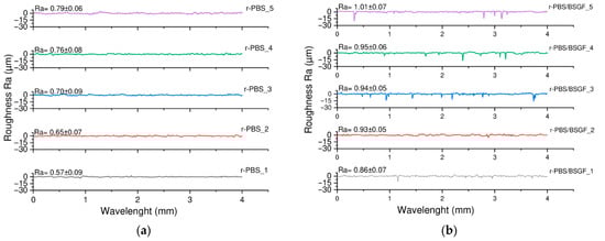 Interesting results and extremely significant results come from the surface roughness analysis of the r-PBS and r-PBS/BSGF samples investigated, see Figure 7a,b. As expected, the presence of BSGF increases the surface roughness from 0.57 μm to 0.86 μm (p < 0.0001). Furthermore, the roughness values for r-PBS_1 and r-PBS_5 are approximately 0.57 μm and 0.79 μm, respectively (p < 0.0001), indicating an increase in surface roughness of approximately 38% during the extrusion cycling. For r-PBS/BSGF_1 and r-PBS/BSGF_5, the roughness values change from 0.86 μm to 1.01 μm (p < 0.0001), indicating an increase of approx. 17.5%, which is significantly less than the change experienced by pure r-PBS during the extrusion cycling. The latter suggests that r-PBS/BSGF shows higher surface roughness due to the presence of BSGF, which changes less with the extrusion cycling compared to the changes for neat r-PBS.