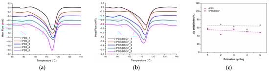 DSC first heating scans of (a) r-PBS and (b) r-PBS/BSGF and (c) crystallinity vs. extrusion cycling.
