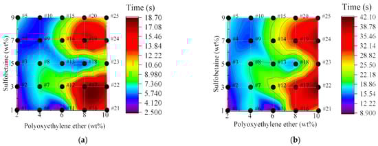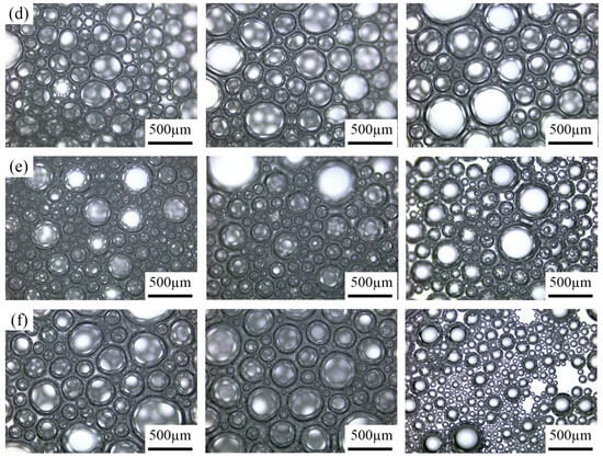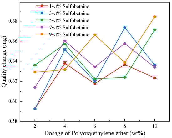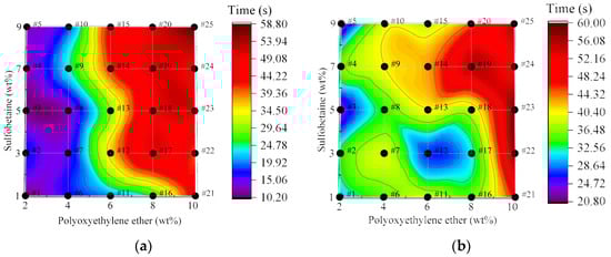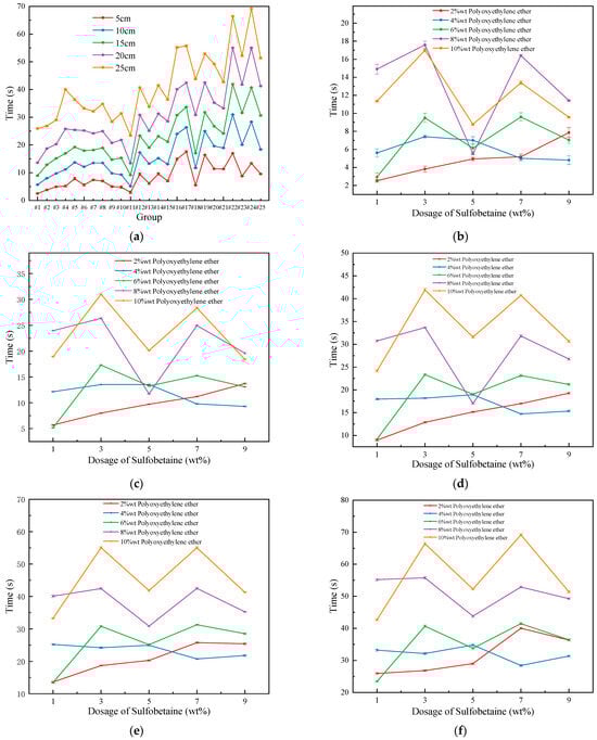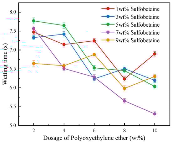 - Adhesiveness–wettability interaction. A similar negative feedback effect is observed between foam adhesiveness and wettability. The overall trend of foam adhesiveness follows that of the solution viscosity, with superior adhesion observed at 3 wt% and 9 wt% Sulfobetaine. Adhesion tests on inclined substrates revealed that the variation in foam adhesion time under inclined conditions is similar to that observed under vertical conditions; however, compared with the vertical orientation, the adhesion time is further extended, and foams on the underside of the board exhibit longer adhesion times than those on the upper side. Foam wettability shows minor deviations from the solution behavior but remains optimal at Polyoxyethylene ether loadings of 8–10 wt%.