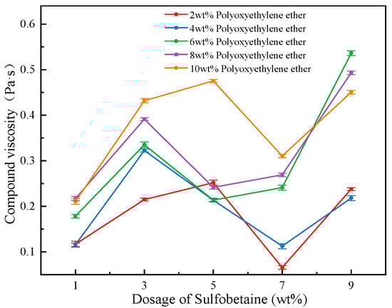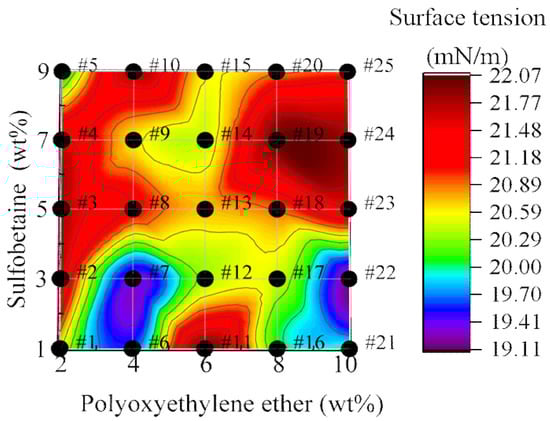- Interplay between viscosity and wettability. A negative feedback effect exists between foam solution viscosity and wettability. At Sulfobetaine loadings of 3 wt% and 9 wt%, the mixture achieves optimal synergistic effects in both intermolecular interactions and surface viscosity enhancement. Wettability reaches its maximum when the concentration of Polyoxyethylene ether is maintained above 8 wt%. The surface tension of all foam solutions is relatively uniform, ranging from 19.0 to 22.5 mN/m, in accordance with national standards and adequate for practical applications.