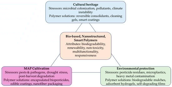 Polymers have long been central to modern materials science, but their durability has also made them major contributors to environmental pollution. A new generation of bio-based and nanostructured polymers is now reshaping this field, offering materials that are functional, reversible, and sustainable. This review examines their role across three interconnected domains: cultural heritage conservation, the protection of medicinal and aromatic plants (MAPs), and environmental sustainability. In heritage science, polymers are moving away from synthetic resins toward renewable systems such as chitosan, nanocellulose, and PLA, which provide stability while remaining reversible and compatible with delicate substrates. In agriculture, biodegradable coatings, controlled-release carriers, and edible films are improving MAP protection, extending shelf life, and reducing reliance on synthetic pesticides. In environmental applications, polymers are being reinvented as solutions rather than problems—through degradable mulches, functional hydrogels, and nanocomposites that clean soils and waters within a circular economy framework. Looking across these domains reveals strong synergies. The same principles—biodegradability, multifunctionality, and responsiveness—apply in each context, turning polymers from passive barriers into intelligent, adaptive systems. Their future success will depend not only on chemistry but also on life-cycle design, policy alignment, and public trust, making polymers key enablers of sustainability.