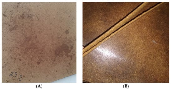 Based on the preliminary results, the ternary system of SCGs, ALS, and thermomechanical fibers was selected for optimization. The binder content, expressed as the combined mass of sum of SCG and ALS relative to oven-dry fibers, was varied from 20% to 80%. At 20% binder content (10% SCG and 10% ALS), non-uniform dispersion was observed, with localized binder accumulation and variable surface gloss. Increasing the binder content to 25% improved uniformity when mixed for three minutes in a blender and pressed at 1.1 MPa and 150 °C for 15 min, although small localized spots persisted. At 30% binder content, a split lignosulfonate approach was applied: half of the ALS was sprayed onto the fibers, while the other half was mixed directly with SCG prior to blending. The panels pressed under these conditions (1.8 MPa, 150 °C, 16 min) showed improved gloss but still exhibited areas with excess binder. Binder levels between 40% and 75% progressively enhanced surface finish and cohesion, and pre-drying fibers at 40% binder content further increased uniformity. However, at 80% binder content, the panels exhibited poor internal cohesion and delaminated upon removal from the press (Figure 1), indicating that excessive binder hindered fiber interlocking. From these trials, 75% binder was established as the upper practical limit for stable composite formation. Accordingly, five final formulations, i.e., 40%, 50%, 60%, 70%, and 75%, were selected for detailed evaluation.